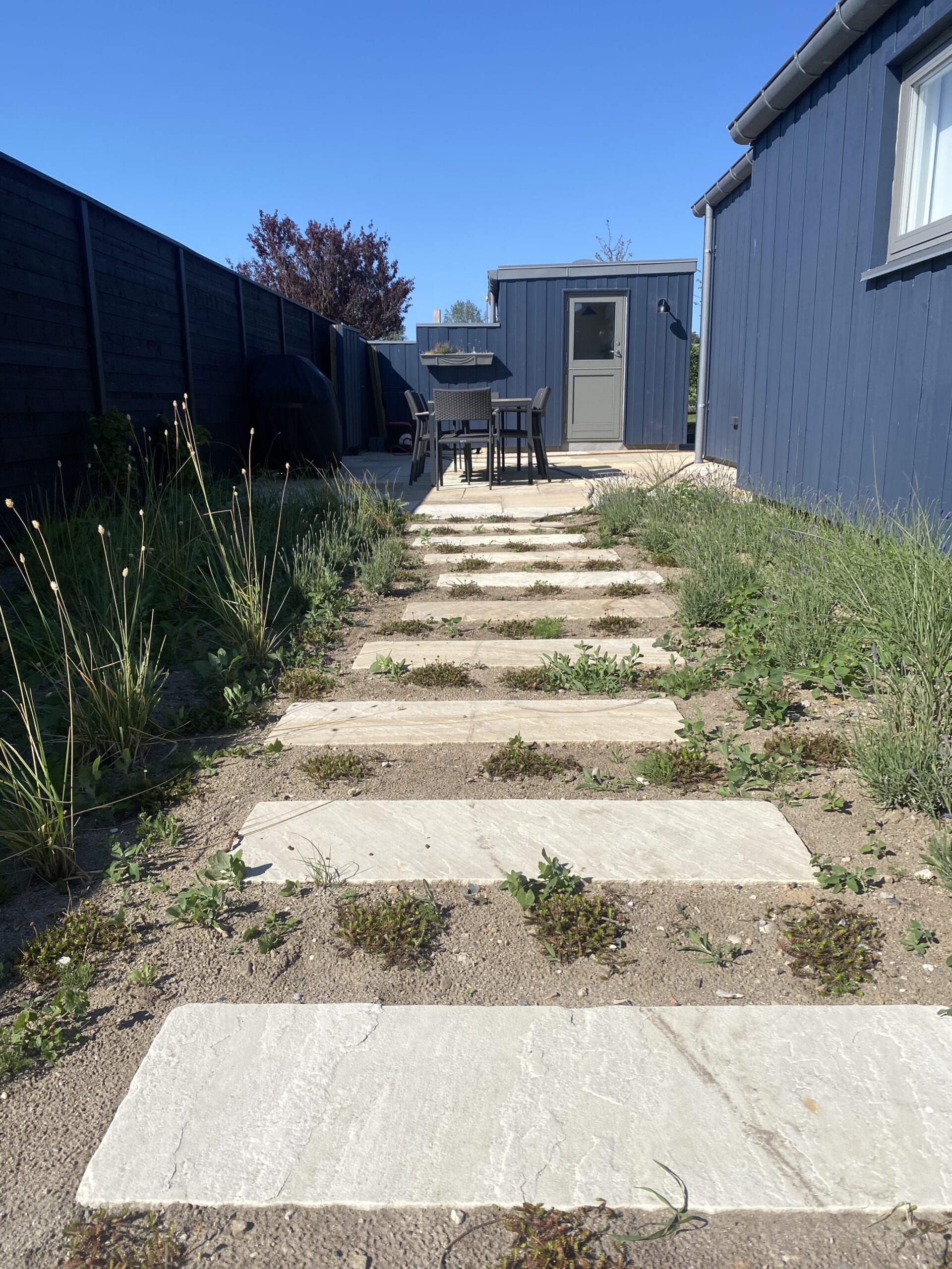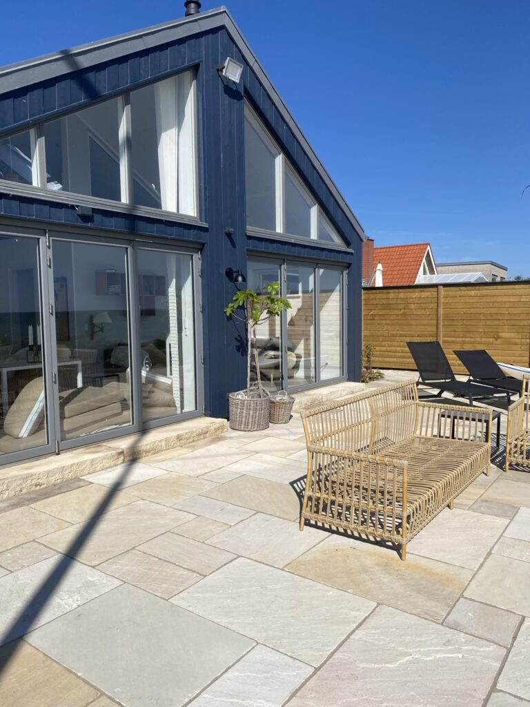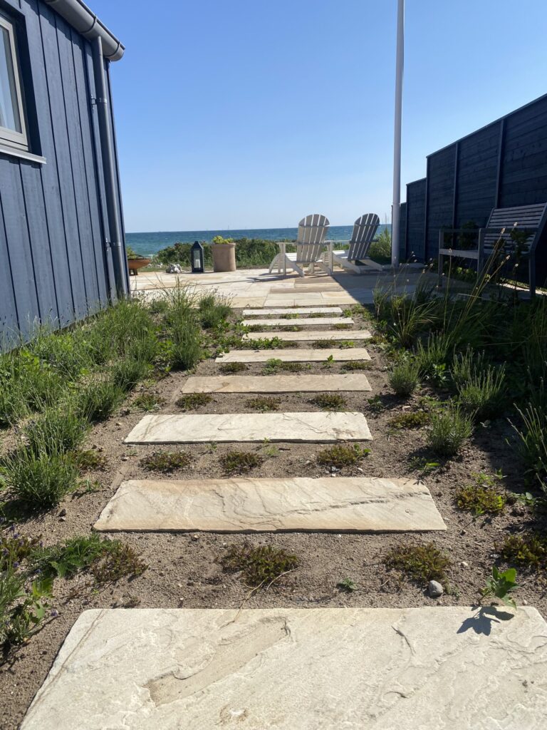 Belægningen er sandsten i farven Sahara som er en fin kontrast til det blågrå sommerhus.